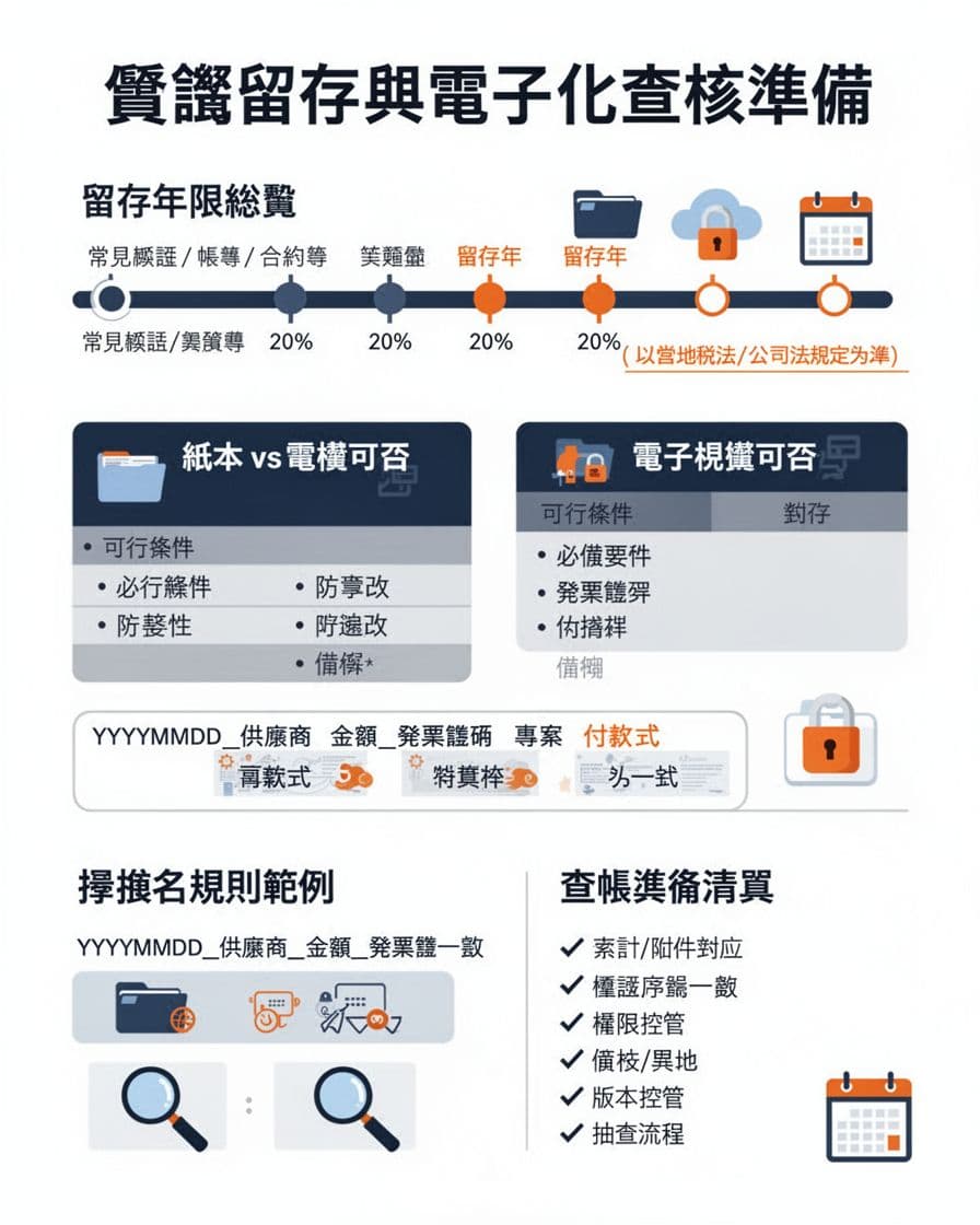 憑證留存多久才夠,用紙本或電子檔都行嗎,掃描命名規則與查帳準備,以下我們用台灣常見法規邏輯,把留存年限、紙本與電子檔的可行做法、掃描命名規則,和查帳準備的眉角整理成一套可落地的做法。